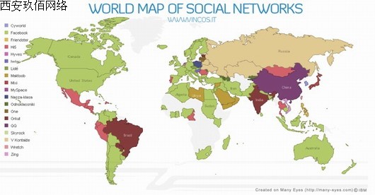 從這張地圖可以看出,雖然Facebook席卷全球,但在很多國家卻遭遇了不同社交網站的抵抗,圖中綠色區(qū)域為Facebook勢力范圍。在俄羅斯,V Kontakte統(tǒng)治著社交網站;在中國,QQ排名第一;在巴西和印度,主要對手是Orkut;在中美洲、秘魯、蒙古和泰國,hi5最受歡迎;在韓國Cyworld大行其道;日本網民最愛mixi;中東地區(qū)是Maktoob;菲律賓網民最支持Friendster。