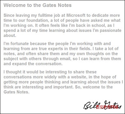 1月21日消息,據(jù)國外媒體報道,微軟董事長比爾·蓋茨(Bill Gates)周三推出了個人網(wǎng)站“Gates Notes”(蓋茨筆記),旨在分享自己的思想、基金會活動、旅途見聞等諸多方面內(nèi)容。