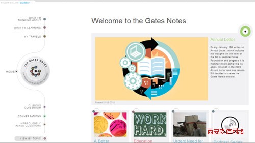 目前,網(wǎng)站已經(jīng)正式開通(http://www.gatesnotes.com/),最初主要內(nèi)容包括教育改革、甲流、海地地震等方面內(nèi)容。而就在一天前,蓋茨剛剛成為微型博客Twitter的用戶。